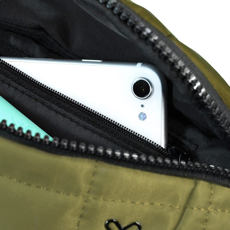 Amplio compartimento con cierre que guarda tus imprescindibles sin alterar tu silueta.