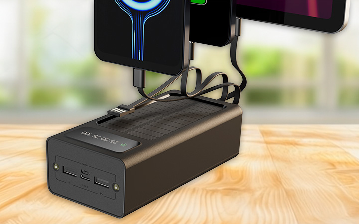 - Opciones de carga versátiles: Equipado con 6 salidas, incluidos dos puertos USB-A, cables de carga Micro-USB, USB-C ® y Lightning ® integrados y un puerto USB-C ® bidireccional (entrada y salida), lo que garantiza la compatibilidad con casi cualquier dispositivo.
