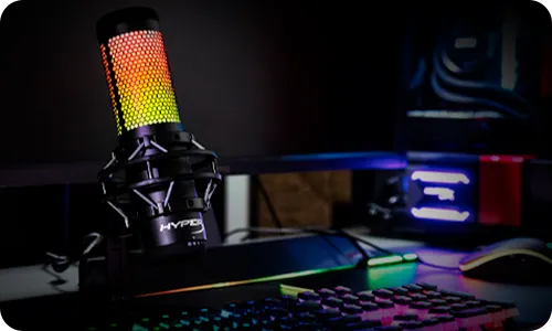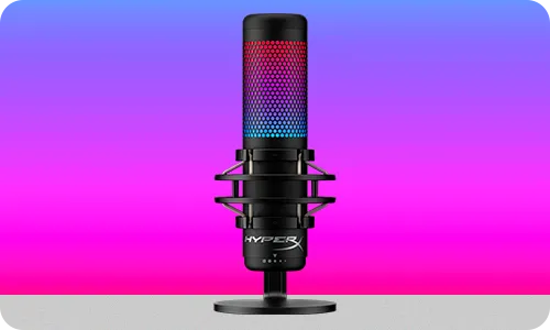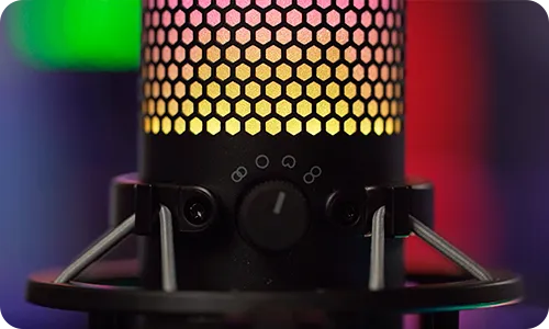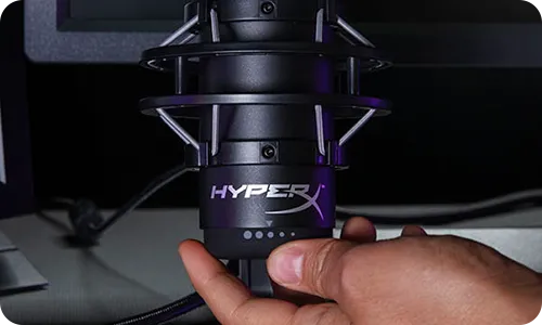 El HyperX QuadCast™ S es un micrófono de condensador USB con excelente sonido y fantástico diseño. La impresionante iluminación RGB personalizable y los efectos dinámicos añaden estilo a cualquier instalación. El QuadCast es un micrófono con todo incluido, que viene con un montaje que no causa vibraciones y un filtro antipop integrado. El indicador LED destaca el estado de su micrófono, y puede simplemente tocar para silenciar para evitar contratiempos en la transmisión. Con cuatro patrones opuestos y un dial de control de volumen, este micrófono está preparado para casi cualquier situación de grabación.