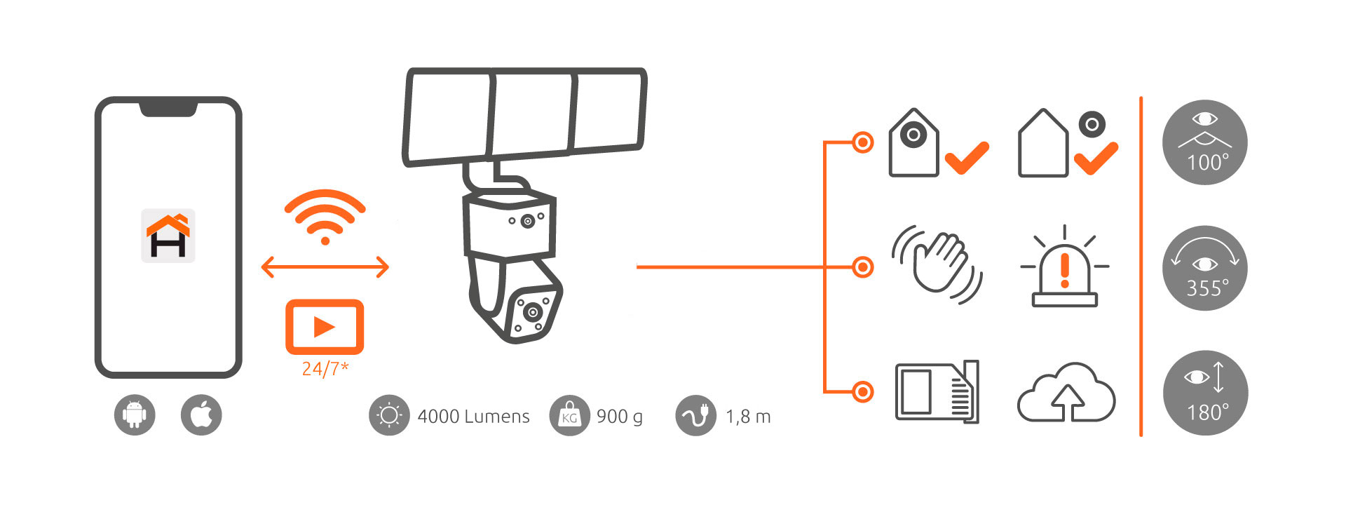 • Audio bidireccional • Botón de reinicio • Detección de sonido • Compatible con la nube