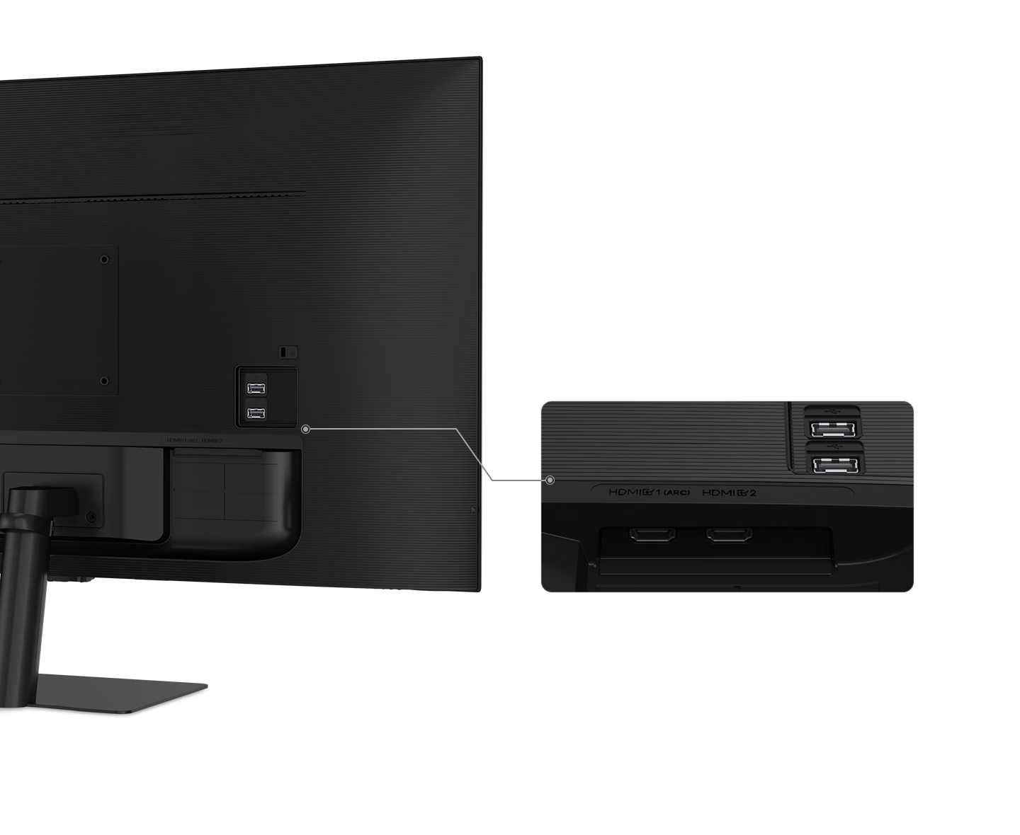 Múltiples puertosConéctese completamente al Smart Monitor y obtenga un control total utilizando todos sus periféricos a la vez: ratón y teclado inalámbricos, auriculares, pantallas adicionales y mucho más. 2 puertos USB-A y 2 puertos HDMI le permiten aprovechar al máximo su configuración, sin complicaciones.