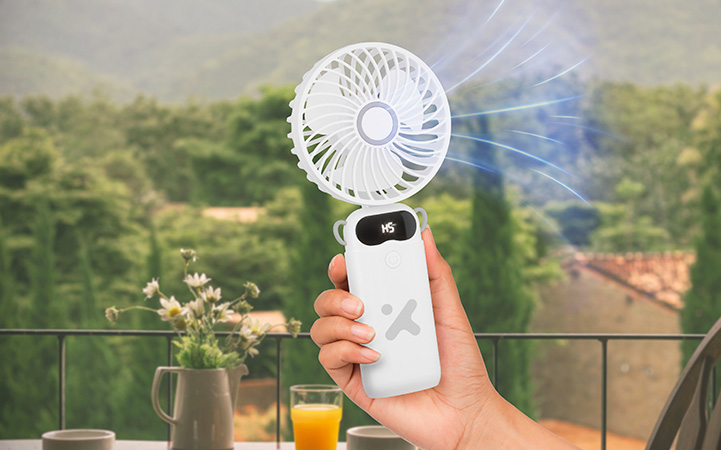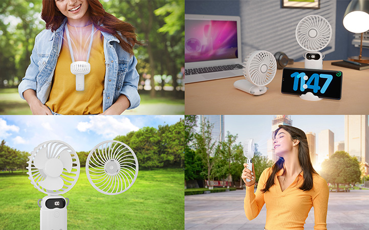Tres formas de uso, un solo ventilador: en la mano, en el escritorio o al cuello.